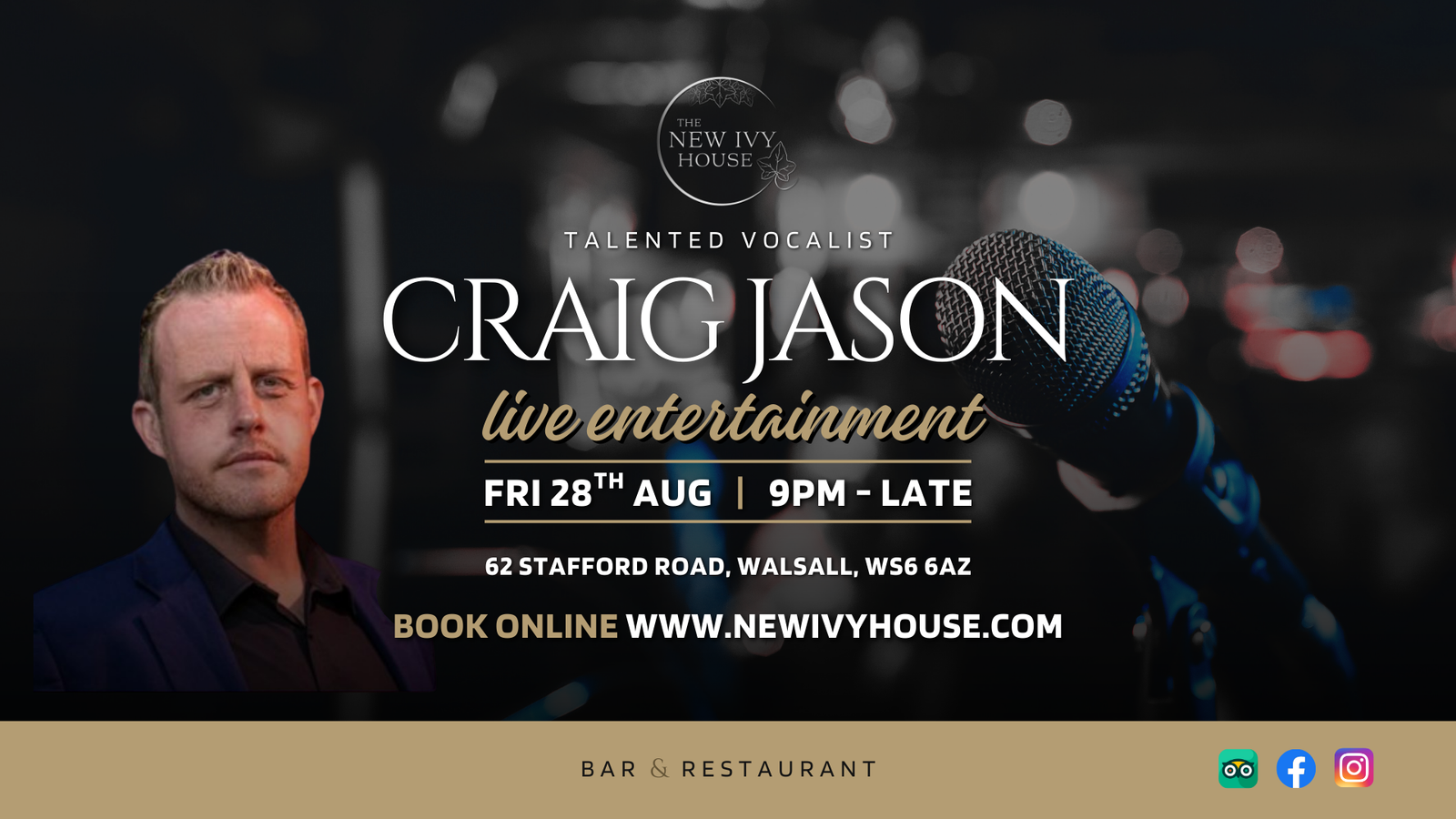 Join us on Friday 28th August for some live entertainment from the fantastic Craig Jason – a talented vocalist performing a mix of popular hits!