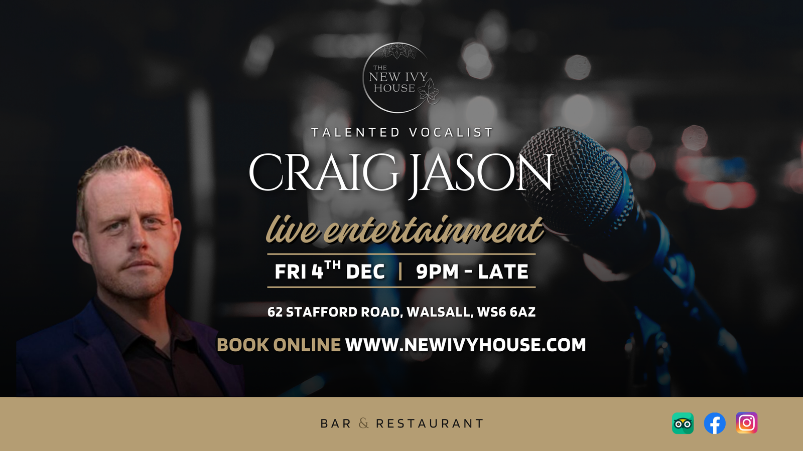 Join us on Friday 4th December for some live entertainment from the fantastic Craig Jason – a talented vocalist performing a mix of popular hits! 🎤