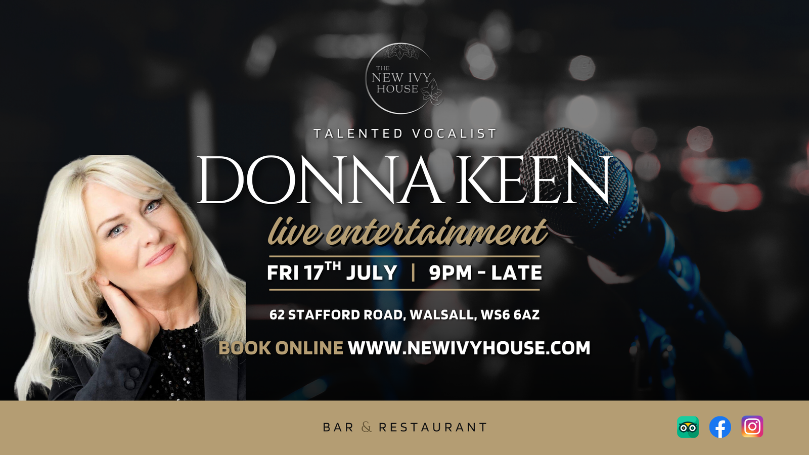 Join us on Friday 17th July for some live entertainment from the fantastic Donna Keen – a talented female vocalist performing a mix of popular hits!